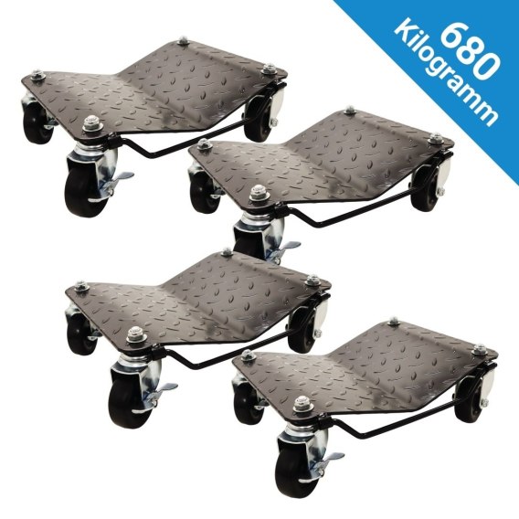 Dzięki solidnej stalowej konstrukcji każdy wózek wytrzymuje obciążenie do 680 kg, co czyni zestaw idealnym do samochodów osobowych. Dwa z czterech kół posiadają hamulce, zapobiegające niekontrolowanemu staczaniu się pojazdu.